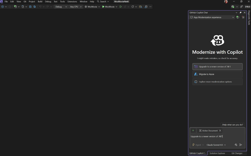 Öffnen Sie Ihr Projekt und starten Sie die Sitzung entweder per Rechtsklick auf die Solution («Modernize») oder direkt im Chat via @modernize. Hier legen Sie fest, ob Sie ein Framework-Upgrade oder eine direkte Migration anstreben.